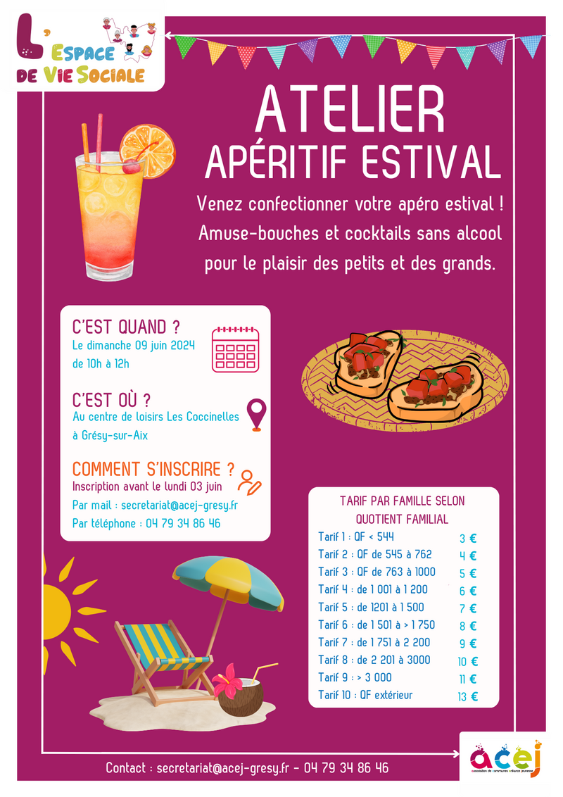 Le dimanche 9 juin, de 10h à 12h au centre de loisirs "Les coccinelles" à Gresy-sur-Aix, venez partager un moment convivial en famille autour d’un atelier festif, ludique et coloré : la préparation d’un apéritif estival !!
